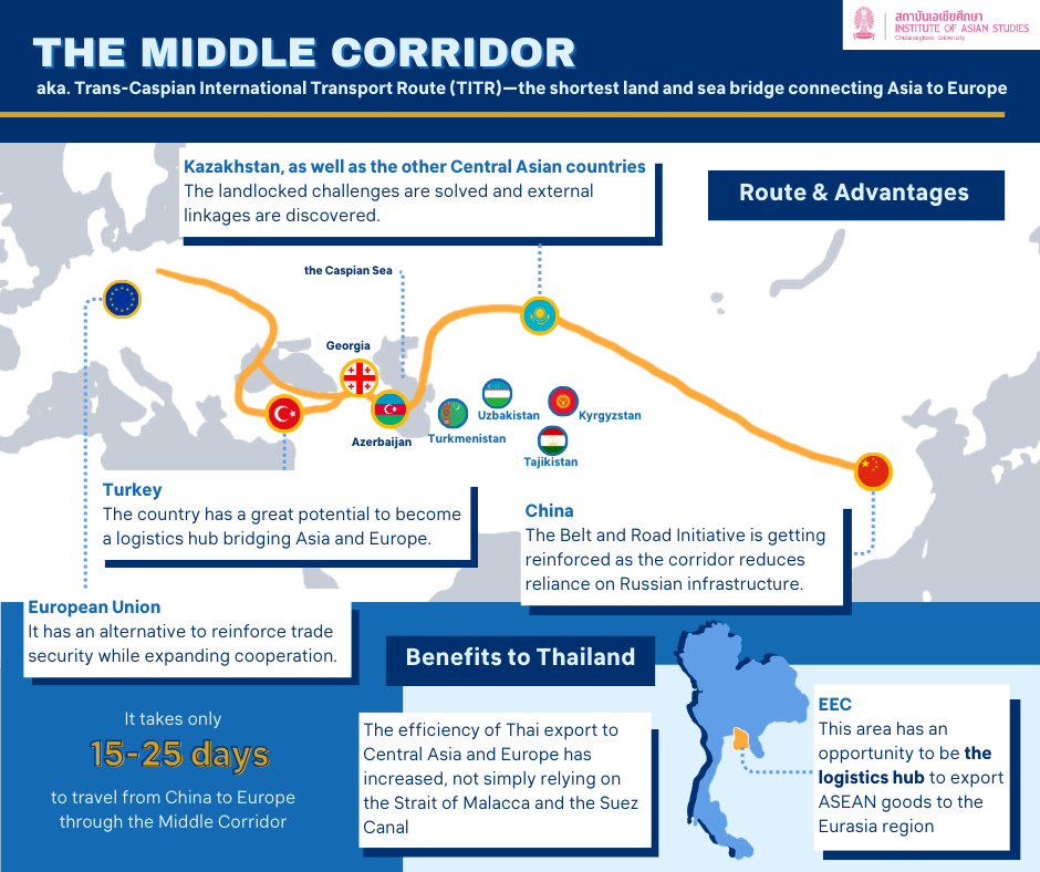 Structurally, the Middle Corridor can reduce transit time to roughly 15-25 days, compared with maritime shipping via the Suez Canal, which generally takes longer. Accordingly, the corridor is not merely a transport route, but a “critical puzzle piece” linking East Asia to Europe via China and Kazakhstan, across the Caspian Sea to Azerbaijan, then onward to Georgia and Türkiye before entering Europe. For Thailand, this corridor offers strategic opportunities to connect ASEAN rail networks through China to wider Eurasian routes, expand agricultural and industrial exports to Central Asia and Eastern Europe, and strengthen Thailand’s role as a Southeast Asian logistics hub, within a CICA framework that increasingly intertwines security with geo-economic dynamics.