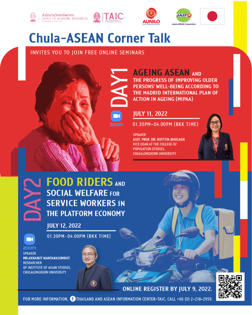Chula-ASEAN Corner would like to invite you to join free online seminars on the topic of: Ageing ASEAN and the progress of improving older persons’ well-being according to the Madrid International Plan of Action in Ageing (MIPAA) on the July 11, 2022.