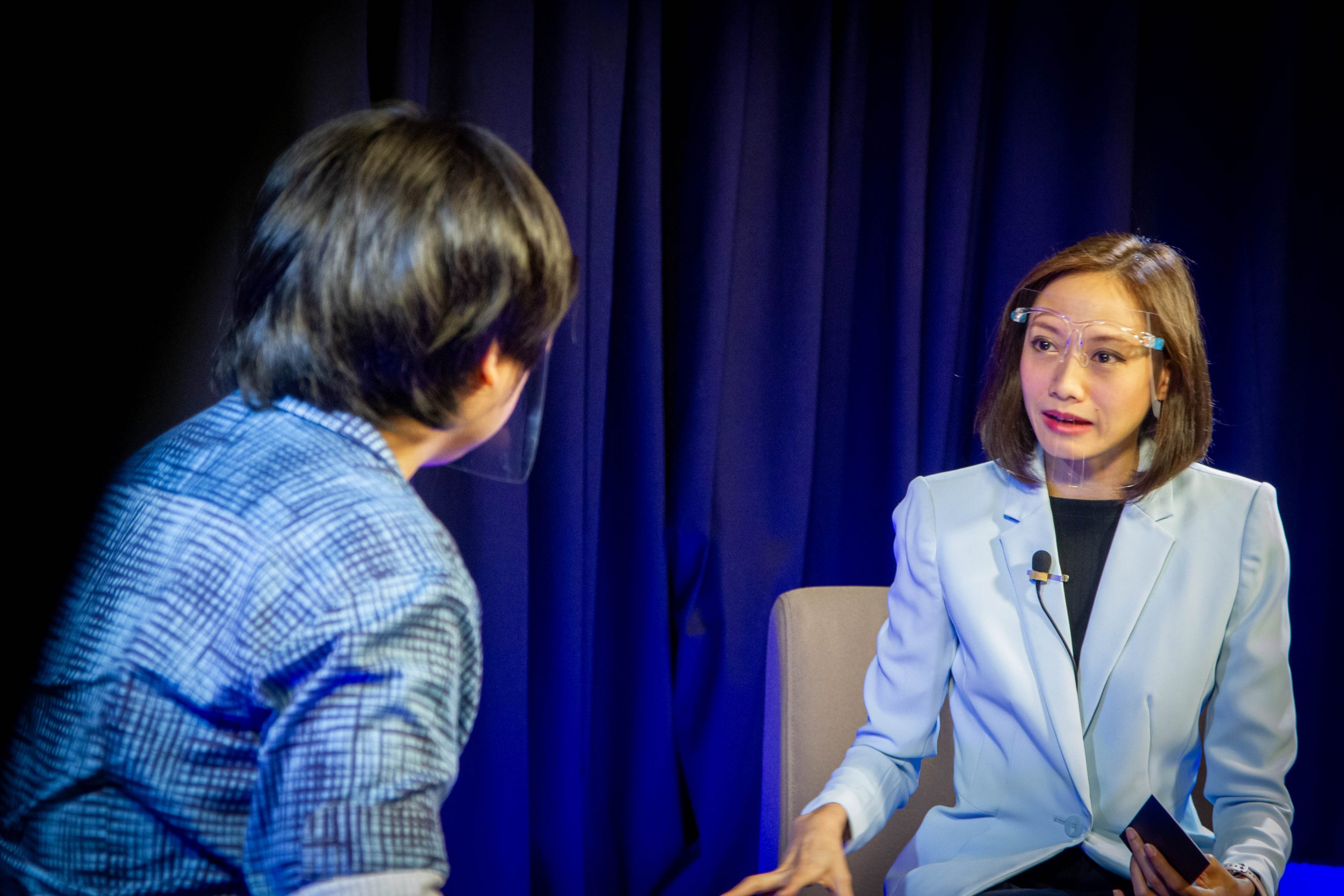 ถ่ายทอดจากห้องปฏิบัติการสตูดิโอ คณะนิเทศศาสตร์ จุฬาลงกรณ์มหาวิทยาลัย.พูดคุยกับวิทยากร