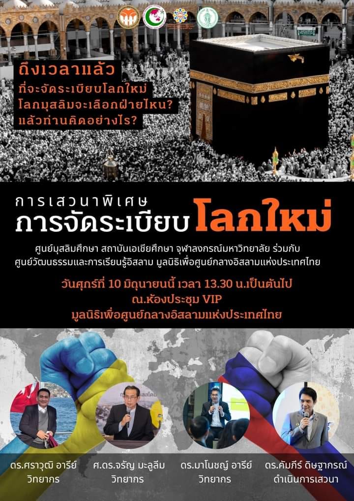 ศูนย์มุสลิมศึกษา สถาบันเอเชียศึกษา จุฬาลงกรณ์มหาวิทยาลัย ร่วมกับศูนย์วัฒนธรรมและการเรียนรู้อิสลาม มูลนิธิเพื่อศูนย์กลางอิสลามแห่งประเทศไทย ขอเชิญร่วมงานเสวนา เรื่อง “ระเบียบโลกใหม่: มุสลิมต้องรับมืออย่างไร”